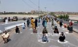 Warga berdiri di area yang ditandai untuk menjaga jarak sosial saat mereka menunggu untuk menerima jatah maanan gratis di di Hyderabad, Pakistan, Senin (30/3). Ini dilakukan selama karantina Provinsi Sindh untuk memerangi penyebaran virus corona SARS-CoV-2 yang menyebabkan penyakit COVID-19 (FOTO : EPA)