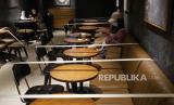 Meja dan kursi disusun dengan jarak untuk membantu mencegah penyebaran coronavirus di Hong Kong, Senin (30/3). (FOTO : AP)