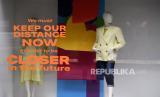 Sebuah etalase toko memasang himbauan untuk menjaga jarak di Dublin City, Irlandia, Kamis (26/3). Menanggapi pandemi Covid-19, pemerintah Irlandia telah menutup semua bisnis yang tidak penting dan meminta orang untuk tinggal di rumah. (FOTO : EPA)