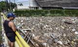 Warga memperhatikan kondisi sampah yang menutupi permukaan Sungai Cikapundung Baru yang bermuara ke Sungai Citarum di Dayeuhkolot, Kabupaten Bandung, Rabu (1/4). Berdasarkan keterangan warga, sudah tiga hari sampah tersebut mengendap di Sungai Cikapundung Baru dan berharap kepada dinas terkait untuk segera melakukan penanganan atau pengerukan di area tersebut guna meminimalisir risiko terjadinya banjir di kawasan tersebut (FOTO : ABDAN SYAKURA/REPUBLIKA)