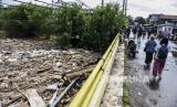 Sejumlah warga melintas di samping Sungai Cikapundung Baru yang ditutupi oleh sampah di Dayeuhkolot, Kabupaten Bandung, Rabu (1/4). Berdasarkan keterangan warga, sudah tiga hari sampah tersebut mengendap di Sungai Cikapundung Baru dan berharap kepada dinas terkait untuk segera melakukan penanganan atau pengerukan di area tersebut guna meminimalisir risiko terjadinya banjir di kawasan tersebut (FOTO : ABDAN SYAKURA/REPUBLIKA)