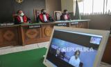 Suasana sidang yang digelar dengan sistem telekonferensi di Pengadilan Negeri Bekasi, Jawa Barat, Rabu (1/4/2020).Pengadilan Negeri Bekasi memberlakukan Sistem sidang telekonferensi dengan menghadirkan hakim, jaksa dan pengacara dan saksi namun untuk terdakwa tetap berada di rumah tahanan (rutan) sebagai upaya mencegah penyebaran COVID-19 (FOTO : ANTARA/Fakhri Hermansyah)
