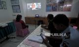 Suasana sidang yang digelar dengan sistem telekonferensi di Pengadilan Negeri Bekasi, Jawa Barat, Rabu (1/4/2020).Pengadilan Negeri Bekasi memberlakukan Sistem sidang telekonferensi dengan menghadirkan hakim, jaksa dan pengacara dan saksi namun untuk terdakwa yang tetap berada di rumah tahanan (rutan) sebagai upaya mencegah penyebaran COVID-19 (FOTO : ANTARA/Fakhri Hermansyah)
