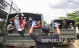 Sejumlah warga binaan yang dibebaskan diantar dengan truk Kostrad di Rutan Kelas 1, Depok, Jawa Barat, Kamis (2/4/2020). Sebanyak 50 warga binaan di Rutan kelas 1 Depok dibebaskan dengan status asimilasi dalam rangka pencegahan dan penanggulangan penyebaran virus corona atau COVID-19 (FOTO : ANTARA FOTO/ASPRILLA DWI ADHA)