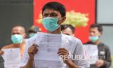 Sejumlah narapidana memperlihatkan surat pembebasan dari masa pidana di Lapas Kelas I Tanjung Gusta Medan, Sumatera Utara, Kamis (2/4/2020). Sebanyak 143 narapidana dan anak di lapas tersebut mendapatkan asimilasi dan hak integrasi dalam rangka pencegahan penyebaran virus COVID-19. (FOTO : Antara/Septianda Perdana)