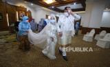 Salah satu pasangan pengantin Yavuz Ozdemir (kanan) dan Irra Chorina Octora (tengah) berjalan beriringan disela-sela acara resepsi pernikahannya di Gedung Negara Grahadi, Surabaya, Jawa Timur, Rabu (25/3/2020). Gubernur Jawa Timur Khofifah Indar Parawansa menggelar resepsi pernikahan dua pasang pengantin Yavuz Ozdemir-Irra Chorina Octora serta Amal Fatchullah-Diana Anggraini yang hanya dihadiri pihak keluarga mempelai guna menghindari pertemuan dengan orang banyak dan meminimalkan penyebaran COVID-19 (FOTO : ANTARA FOTO)