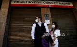 Pengantin pria Rafael (kiri) dan pengantin wanita Miki (kanan) mengenakan masker saat menunggu di luar kantor catatan sipil untuk menikah di Madrid, Spanyol, Jumat (13/3). Pemerintah Madrid memutuskan semua upacara pernikahan harus diadakan tertutup karena pandemi COVID-19 yang disebabkan SARS CoV-2 virus Corona (FOTO : CHEMA MOYA/EPA-EFE)