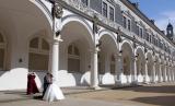 Pasangan yang baru menikah Laila (kanan) dan Boualem Bellil difoto oleh ibu Laila (kiri) di Stall Courtyard, tempat wisata paling sering dikunjungi di Dresden, Jerman TImur, Kamis (26/3). Mereka merayakan hari pernikahannya tanpa tamu karena peraturan pemerintah dan akan menjadwalkan ulang pestanya pada tahun depan (FOTO : Jens Meyer/AP)