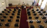 Pengantin laki-laki Gyorgy David Jablonovszky dan istrinya Timea Jablonovszky saat menghadiri upacara pernikahan mereka di ruangan yang hampir kosong di balai kota Miskolc, Hongaria, Sabtu (28/3). Pasangan pengantin baru itu merayakan pernikahanya dengan hanya beberapa kerabat dan tanpa tamu karena peraturan pemerintah untuk mencegah penyebaran virus Corona (FOTO : MTI)