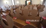 Potongan karton berbentuk orang yang mewakilkan keluarga dan teman-teman difoto, ketika Dan Stuglik dan Amy Simonson melakukan persiapan untuk pernikahan mereka di The Old Rugged Cross Church, Pokagon, Mich, Selasa (31/3). Pandemi Covid-19 memaksa pasangan itu untuk mengubah rencana awal yang akan mengundang 150 orang menjadi hanya segelintir yang akan hadir, tetapi dengan bantuan dan sumbangan guntingan dari Menasha Packaging, bangku-bangku tersebut dapat terisi (FOTO : DON CAMPBELL/The Herald-Palladium)