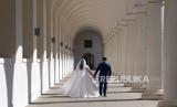 Pasangan yang baru menikah Laila (kiri) dan Boualem Bellil berjalan di Stall Courtyard, tempat wisata paling sering dikunjungi di Dresden, Jerman TImur, Kamis (26/3). Mereka merayakan hari pernikahannya tanpa tamu karena peraturan pemerintah dan akan menjadwalkan ulang pestanya pada tahun depan (FOTO : AP)