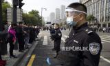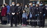 Warga dan polisi menundukkan kepala mereka pada saat hari berkabung nasional untuk para korban virus corona di Wuhan, Provinsi Hubei, China, Sabtu (4/4). China mengadakan hari berkabung nasional bagi orang-orang yang meninggal selama wabah virus corona dan COVID-19 (FOTO : AP/Ng Han Guan)