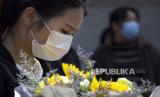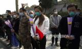 Warga membawa bunga saat hari berkabung nasional untuk para korban Covid-19 di Wuhan, Provinsi Hubei, China, Sabtu (4/4). China mengadakan hari berkabung nasional bagi orang-orang yang meninggal selama wabah virus corona dan COVID-19 (FOTO : AP/Ng Han Guan)