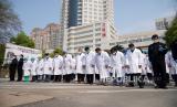 Pekerja medis menundukkan kepala mereka pada saat hari berkabung nasional untuk para korban virus corona di Wuhan, Provinsi Hubei, China, Sabtu (4/4). China mengadakan hari berkabung nasional bagi orang-orang yang meninggal selama wabah virus corona dan COVID-19 (FOTO : Xinhua via AP/Cai Yang )