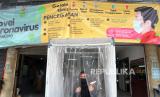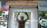 Warga berada di dalam bilik disinfektan di pasar tradisional Sukasari, Kota Bogor, Jawa Barat, Sabtu (4/4/2020). Pemerintah Kota Bogor melalui PD (FOTO : ANTARA)