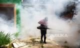 Warga berjalan saat pengasapan (fogging) di kawasan Pondok Jaya, Cipayung, Depok, Jabar, Ahad (5/4/2020). Kegiatan tersebut guna memberantas nyamuk Aedes aegypti sekaligus mencegah wabah DBD (FOTO : ANTARA/ANDIKA WAHYU)
