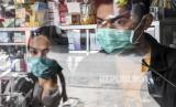 Pegawai apotek mengenakan masker melayani pembeli di balik sekat di Apotek Contong, Jalan Warung Contong, Kota Cimahi, Ahad (5/4). Pemasangan sekat tersebut bertujuan untuk memberikan batas antara pegawai dengan pembeli saat bertransaksi guna meminimalisir penyebaran virus Corona (Covid-19) melalui tetesan air liur (droplets) (FOTO : ABDAN SYAKURA/REPUBLIKA)