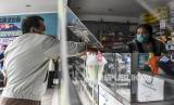 Aktivitas jual beli di Apotek Contong yang dipasangi sekat di Jalan Warung Contong, Kota Cimahi, Ahad (5/4). Pemasangan sekat tersebut bertujuan untuk memberikan batas antara pegawai dengan pembeli saat bertransaksi guna meminimalisir penyebaran virus Corona (Covid-19) melalui tetesan air liur (droplets) (FOTO : ABDAN SYAKURA/REPUBLIKA)