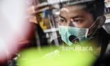 Pegawai apotek mengenakan masker berinteraksi dengan pembeli menggunakan pengeras suara di balik sekat di Apotek Contong, Jalan Warung Contong, Kota Cimahi, Ahad (5/4). Pemasangan sekat tersebut bertujuan untuk memberikan batas antara pegawai dengan pembeli saat bertransaksi guna meminimalisir penyebaran virus Corona (Covid-19) melalui tetesan air liur (droplets) (FOTO : ABDAN SYAKURA/REPUBLIKA)