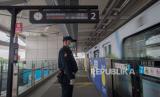 Petugas keamanan menggunakan masker saat berjaga di Stasiun Moda Raya Terpadu (MRT) Lebak Bulus, Jakarta Selatan, Senin (6/4). Berdasarkan anjuran Organisasi Kesehatan Dunia (WHO) Pemerintah Provinsi DKI Jakarta mengimbau seluruh masyarakat yang berada di luar rumah serta pengguna transportasi umum mulai tanggal 12 April 2020 wajib menggunakan masker sebagai upaya mengantisipasi penyebaran COVID-19 (FOTO : Republika/Thoudy Badai)