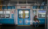 Penumpang menggunakan masker saat menaiki kereta Moda Raya Terpadu (MRT) di Stasiun MRT Lebak Bulus, Jakarta Selatan, Senin (6/4). Berdasarkan anjuran Organisasi Kesehatan Dunia (WHO) Pemerintah Provinsi DKI Jakarta mengimbau seluruh masyarakat yang berada di luar rumah serta pengguna transportasi umum mulai tanggal 12 April 2020 wajib menggunakan masker sebagai upaya mengantisipasi penyebaran COVID-19 (FOTO : Republika/Thoudy Badai)
