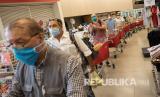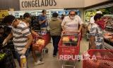 Sejumlah laki-laki belanja di supermarket di Lima, Peru, Jumat (3/4). Pemerintah membatasi pergerakan warga berdasarkan gender imbas dari penyebaran virus Corona. Hari Jumat diperuntukan bagi laki-laki yang bisa meninggalkan rumah untuk membeli kebutuhan barang pokok. (FOTO : AP/Rodrigo Abd)