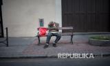 Seorang lelaki memakai masker tertidur di bangku di Lima, Peru, Jumat (3/4). Pemerintah membatasi pergerakan warga berdasarkan gender imbas dari penyebaran virus Corona. Hari Jumat diperuntukan bagi laki-laki yang bisa meninggalkan rumah untuk membeli kebutuhan barang pokok. (FOTO : AP/Rodrigo Abd)