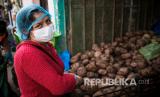 Seorang perempuan memakai masker dan sarung saat belanja di pasar popular, Lima, Peru, Sabtu (4/4). Pemerintah membatasi pergerakan warga berdasarkan gender imbas dari penyebaran virus Corona. Hari Sabtu diperuntukan bagi perempuan yang bisa meninggalkan rumah untuk membeli kebutuhan barang pokok. (FOTO : AP Photo/Rodrigo Abd)
