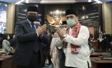 Gubernur DKI Jakarta Anies Baswedan (kiri) didampingi Wakil Gubernur DKI Jakarta terpilih Ahmad Riza Patria (kanan) memberi salam usai pemilihan di Gedung DPRD DKI Jakarta di Jakarta, Senin (6/4/2020). Pada pemilihan Wakil Gubernur DKI Jakarta sisa masa jabatan 2017-2022 oleh DPRD DKI Jakarta, politisi Gerindra Ahmad Riza Patria memperoleh 81 suara sedangkan politisi PKS Nurmansyah memperoleh 17 suara sedangkan dua suara tidak sah (FOTO : ANTARAFOTO)