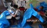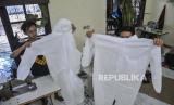 Penjahit menyelesaikan proses pembuatan APD (Alat Pelindung Diri) di Pondok Kelapa, Jakarta Timur, Senin (6/4/2020). Dalam 1 hari industri rumahan tersebut dapat memproduksi 100 buah APD untuk membantu tim medis menangani pasien COVID-19 (FOTO : Antara/Fakhri Hermansyah)