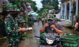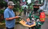 Anggota TNI membagikan masker kepada warga di Gebog, Kudus, Jawa Tengah, Senin (6/4/2020). Sebanyak 200 masker dibagikan secara gratis kepada warga dan anggota TNI menyusul imbauan Organisasi Kesehatan Dunia (WHO) dan pemerintah agar masyarakat menggunakan masker saat berada di luar rumah untuk mengurangi risiko penyebaran COVID-19 (FOTO : ANTARA/Yusuf Nugroho)