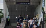 Sejumlah perkerja menggunakan masker berjalan keluar dari stasiun MRT Dukuh Atas BNi di Jakarta, Selasa (7/4). Kementerian Kesehatan Terawan Agus Putranto menyetujui status Pembatasan Sosial Berskala Besar (PSBB) di Provinsi DKI Jakarta diantaranya pembatasan moda transportasi, pembatasan kegiatan keagamaan, peliburan sekolah dan tempat kerja, pembatasan kegiatan sosial dan budaya, serta kegiatan ditempat fasilitas umum (FOTO : Republika/Thoudy Badai)