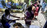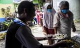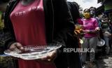 Warga membagikan makan siang gratis kepada warga di Lio Genteng, Astana Anyar, Kota Bandung, Rabu (8/4). Pembagian makan siang gratis dari swadaya warga setempat tersebut merupakan bentuk kepedulian terhadap sesama serta untuk meringankan beban warga di tengah pandemi Covid-19 (FOTO : ABDAN SYAKURA/REPUBLIKA)