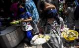 Sejumlah warga mengantre untuk mendapatkan makan siang gratis di Lio Genteng, Astana Anyar, Kota Bandung, Rabu (8/4). Pembagian makan siang gratis dari swadaya warga setempat tersebut merupakan bentuk kepedulian terhadap sesama serta untuk meringankan beban warga di tengah pandemi Covid-19 (FOTO : ABDAN SYAKURA/REPUBLIKA)