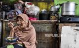 Seorang warga memakan makanan yang dibagikan di Lio Genteng, Astana Anyar, Kota Bandung, Rabu (8/4). Pembagian makan siang gratis dari swadaya warga setempat tersebut merupakan bentuk kepedulian terhadap sesama serta untuk meringankan beban warga di tengah pandemi Covid-19 (FOTO : ABDAN SYAKURA/REPUBLIKA)