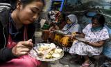 Sejumlah warga memakan makanan yang dibagikan di Lio Genteng, Astana Anyar, Kota Bandung, Rabu (8/4). Pembagian makan siang gratis dari swadaya warga setempat tersebut merupakan bentuk kepedulian terhadap sesama serta untuk meringankan beban warga di tengah pandemi Covid-19 (FOTO : ABDAN SYAKURA/REPUBLIKA)