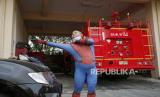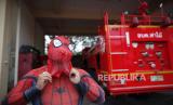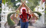 Petugas pemadam kebakaran Thailand Sittiporn Singthong berpakaian sebagai Spider-Man sebelum memulai menyemprotkan desinfektan di Kantor Administrasi Kecamatan di provinsi Samut Sakhon, Thailand, Kamis (9/4). Sittiporn yang mengenakan kostum Spider-Man disaat melakukan tugas ini bertujuan untuk menghibur penduduk agar tidak khawatir dan takut terhadap Covid-19 yang telah menginfeksi lebih dari 1,5 juta orang di seluruh dunia (FOTO : EPA-EFE / RUNGROJ YONGRIT)