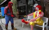 Petugas pemadam kebakaran Thailand Sittiporn Singthong dengan berpakaian pahlawan super Spider-Man menyemprotkan desinfektan didekat patung makanan cepat saji McDonal di kawasan Wat Tha Kuil Budha Mai di provinsi Samut Sakhon, Thailand, Kamis (9/4). Sittiporn yang mengenakan kostum Spider-Man disaat melakukan tugas ini bertujuan untuk menghibur penduduk agar tidak khawatir dan takut terhadap Covid-19 yang telah menginfeksi lebih dari 1,5 juta orang di seluruh dunia (FOTO : EPA-EFE / RUNGROJ YONGRIT)