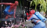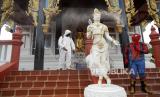 Petugas pemadam kebakaran Thailand, Sittiporn Singthong dengan berpakaian pahlawan super Spider-Man menyemprotkan desinfektan pada patung karakter Spider-Man yang sama seperti dirinya di Kawasan kuil Buddha Wat Tha Mai di provinsi Samut Sakhon, Thailand, Kamis (9/4). Sittiporn yang mengenakan kostum Spider-Man disaat melakukan tugas ini bertujuan untuk menghibur penduduk agar tidak khawatir dan takut terhadap Covid-19 yang telah menginfeksi lebih dari 1,5 juta orang di seluruh dunia (FOTO : EPA-EFE / RUNGROJ YONGRIT)