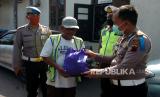 Petugas kepolisian memberikan sembako kepada juru parkir di wilayah Kota Tegal, Jawa Tengah, Kamis (9/4/2020). Pembagian paket sembako kepada pengayuh becak, juru parkir dan warga kurang mampu tersebut untuk membantu meringankan beban masyarakat kurang mampu yang terdampak COVID-19 (FOTO : ANTARA FOTO)
