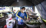 Petugas Taruna Siaga Bencana (Tagana) mengemas paket nasi bungkus di Dapur Umum Kementerian Sosial Peduli Dampak COVID-19 di Kompleks Gedung Konvensi Taman Makam Pahlawan Nasional Utama Kalibata, Jakarta, Sabtu (11/4/2020). (FOTO : Antara/Aprillio Akbar)