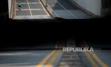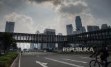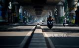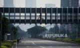 Suasana lengang di jalan Sudirman saat pemberlakuan pembatasan sosial berskala besar (PSBB) untuk menekan penyebaran COVID-19, Jakarta, Ahad (12/4). Memasuki hari ketiga pemberlakuan pembatasan sosial berskala besar (PSBB) sejumlah ruas jalan di Jakarta mulai sepi dari kendaraan roda dua dan empat (FOTO : Republika/Thoudy Badai)