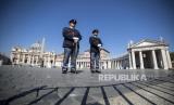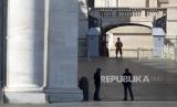 Petugas keamanan berjaga di depan lapangan Santo Petrus yang sepi selama Misa Minggu Paskah yang dilakukan secara tertutup di Basilika Santo Petrus, Vatikan, Ahad (12/4). Misa minggu paskah diadakan secara tertutup untuk mencegah penyebaran virus COVID-19. (FOTO : EPA-EFE/ANGELO CARCONI)