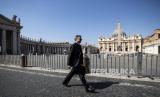 Seorang warga berjalan di depan lapangan Santo Petrus yang sepi selama Misa Minggu Paskah yang dilakukan secara tertutup di Basilika Santo Petrus, Vatikan, Ahad (12/4). Misa minggu paskah diadakan secara tertutup untuk mencegah penyebaran virus COVID-19. (FOTO : EPA-EFE/ANGELO CARCONI)