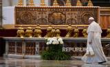 Paus Fransiskus meninggalkan ruangan seusai memimpin Misa Minggu Paskah yang dilakukan secara tertutup di Basilika Santo Petrus, Vatikan, Ahad (12/4). Misa minggu paskah diadakan secara tertutup untuk mencegah penyebaran virus COVID-19. (FOTO : EPA-EFE/ANDREAS SOLARO/POOL)