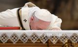 Paus Fransiskus mencium altar saat memimpin Misa Minggu Paskah yang dilakukan secara tertutup di Basilika Santo Petrus, Vatikan, Ahad (12/4). Misa minggu paskah diadakan secara tertutup untuk mencegah penyebaran virus COVID-19. (FOTO : EPA-EFE/ANDREAS SOLARO/POOL)