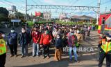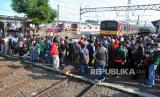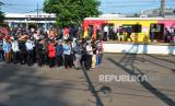 REPUBLIKA.CO.ID, BOGOR -- Pembatasan jam operasional KRL dibatasi pada masa PSBB di Jakarta. Namun pembatasan tidak mengurangi jumlah penumpang kereta di Stasiun Bogor, Jawa Barat, Senin (13/4). Antrean panjang calon penumpang terjadi.