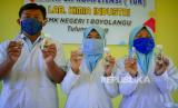 Siswa menunjukkan cairan hand sanitizer kemasan berbahan dasar ethanol 96 persen (C2H5OH) yang dicampur dengan larutan senyawa hidrogen peroksida (H2O2), gliserin (C3H8O3), dan aquades atau air steril (H2O) di laboratorium kimia SMKN 1 Boyolangu, Tulungagung, Jawa Timur, Senin (13/04). Cairan hand sanitizer hasil olahan siswa itu selanjutnya didonasikan ke masyarakat sekitar sebagai bagian dari program kampanye hidup bersih serta mencegah penularan virus Corona atau COVID-19 di daerah itu (FOTO : ANTARA FOTO)