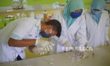 Siswa membuat cairan hand sanitizer berbahan dasar ethanol 96 persen (C2H5OH) yang dicampur dengan larutan senyawa hidrogen peroksida (H2O2), gliserin (C3H8O3), dan aquades atau air steril (H2O) di laboratorium kimia SMKN 1 Boyolangu, Tulungagung, Jawa Timur, Senin (13/04). Cairan hand sanitizer hasil olahan siswa itu selanjutnya didonasikan ke masyarakat sekitar sebagai bagian dari program kampanye hidup bersih serta mencegah penularan virus Corona atau COVID-19 di daerah itu (FOTO : ANTARA FOTO)
