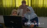 Guru operator memantau pelaksanaan ujian tengah semester secara daring melalui perangkat/piranti komputer di SMKN 1 Boyolangu, Tulungagung, Jawa Timur, Senin (13/04). Ujian sekolah itu iikuti 1.636 siswa kelas X dan XI yang dikerjakan secara daring dari rumah masing-masing selama pandemi virus Corona untuk mencegah penularan wabah COVID-19. (FOTO : Antara/Destyan Sujarwoko)